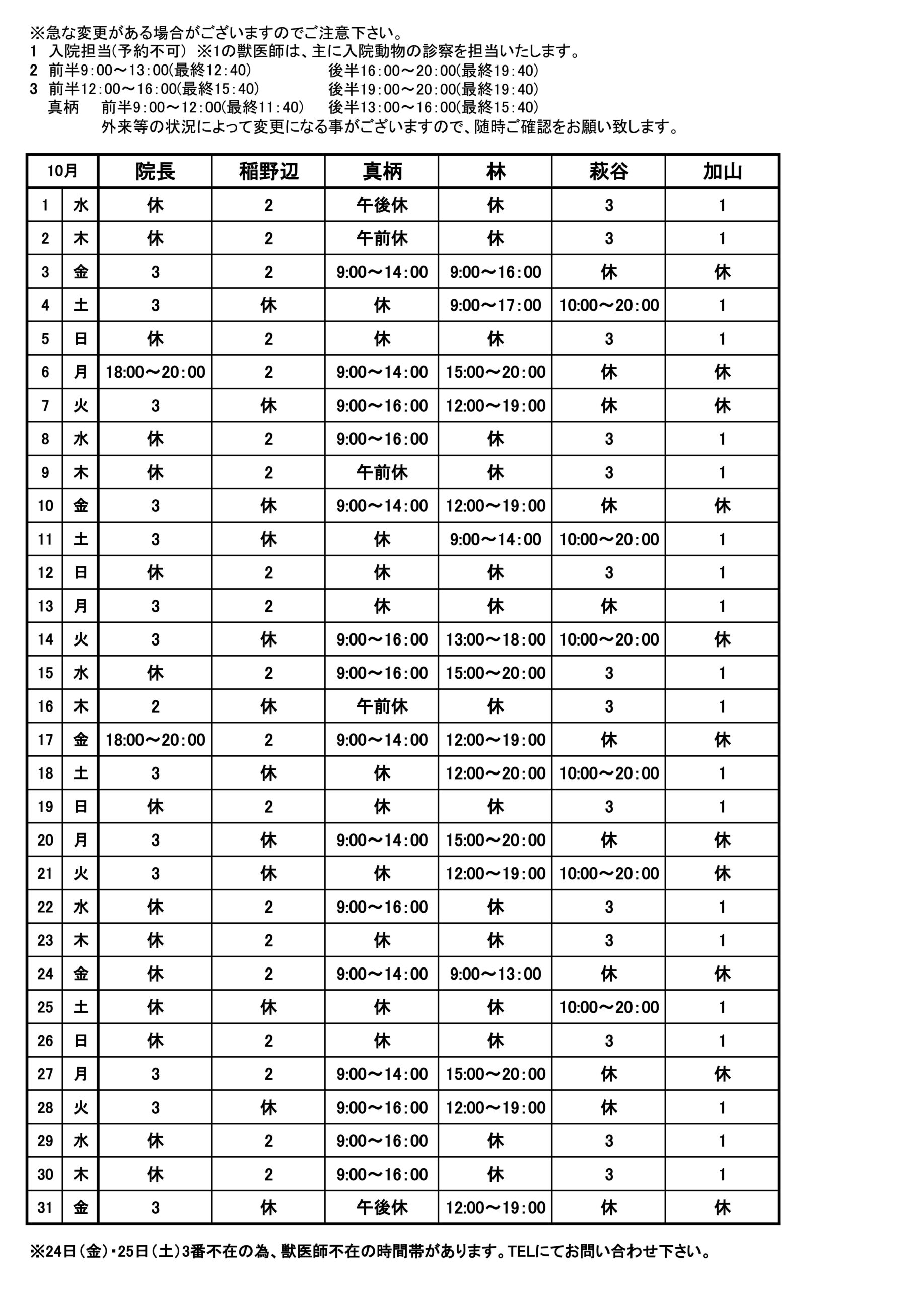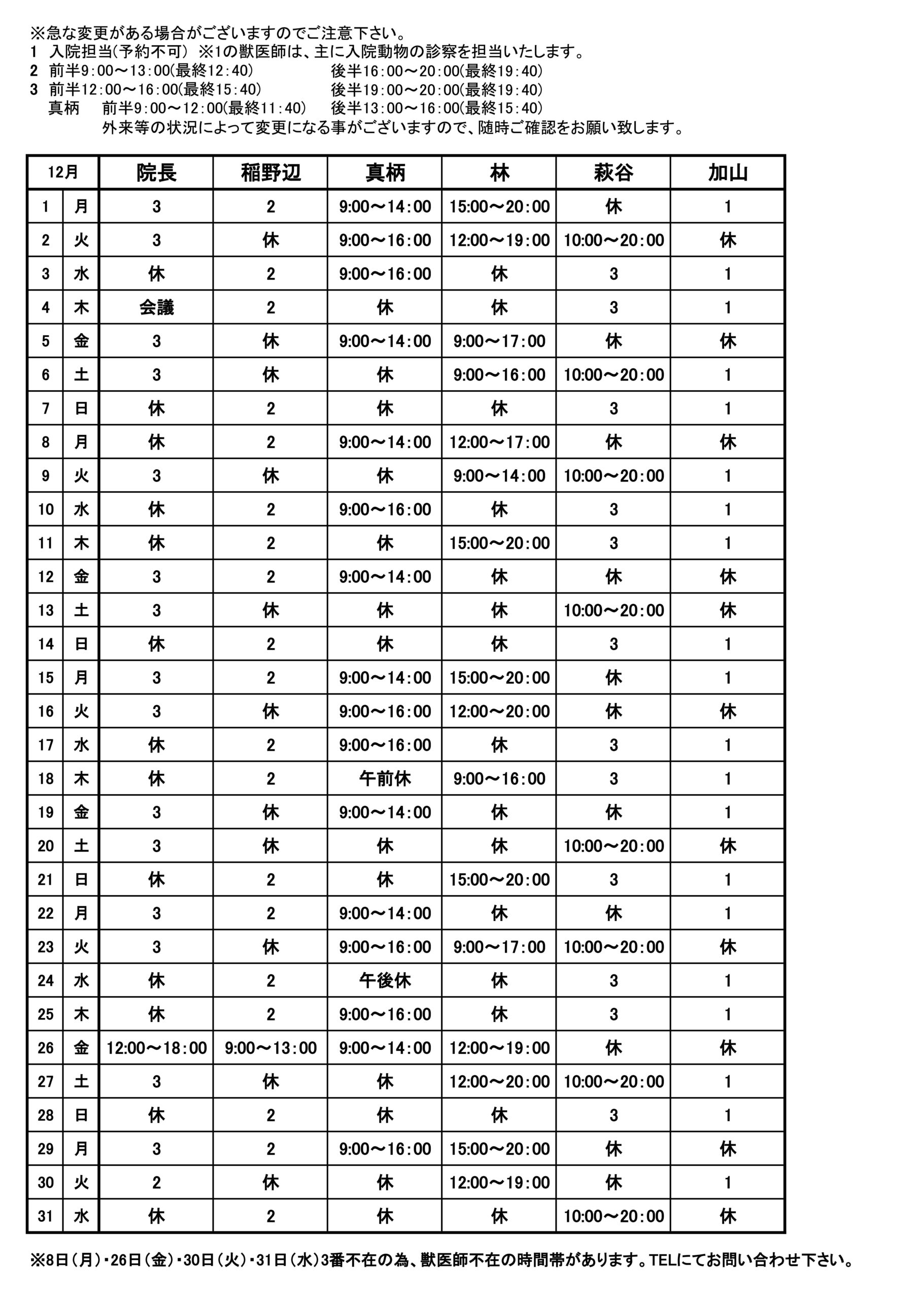 院内でお配りしている出勤表とは獣医師の並びが異なりますのでご注意下さい。